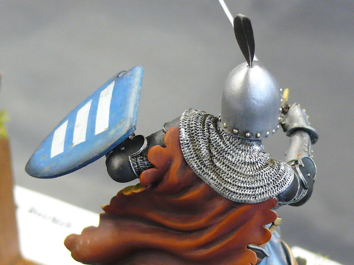 The knight, whose figurine is presented in the photo, is wearing plate armor. The plates of such armor had a thickness of 1 to 3 mm (0.04-0.12 in). The weight of its was about 25 kg (55 lb).